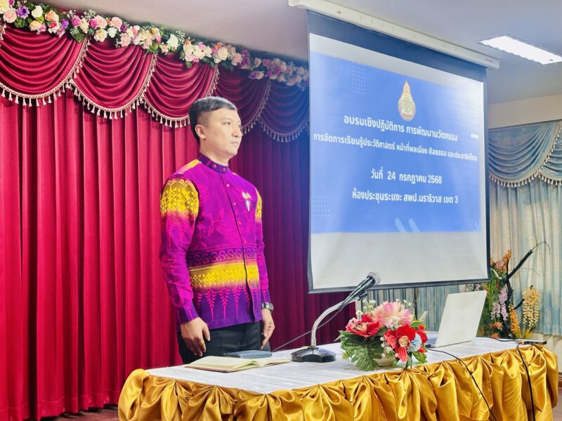 วันที่ 24 กรกฎาคม 2568 เวลา 13:30น. นายตอฮีรน หะยีเลาะแม ผอ.สพป.นราธิวาส เขต 3 มอบหมายให้ นายศุภวุฒิ สุภาชาติ รอง ผอ.สพป.นราธิวาส เขต 3 เป็นประธานเปิดการอบรมเชิงปฏิบัติการการพัฒนานวัตกรรมการจัดการเรียนรู้ประวัติศาสตร์ หน้าที่ลเมือง ศีลธรรม และประชาธิปไตย ประจำปีการศึกษา 2568 ณ ห้องประชุมระแงะ สพป.นราธิวาส เขต 3