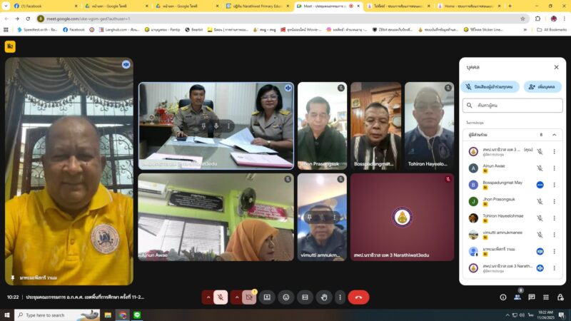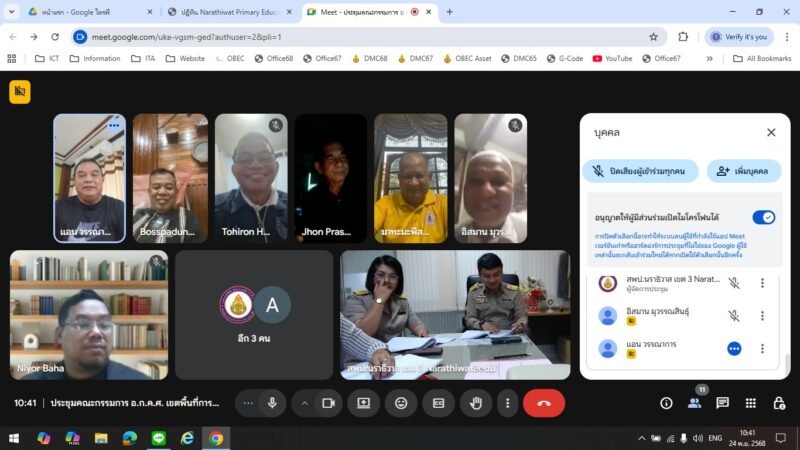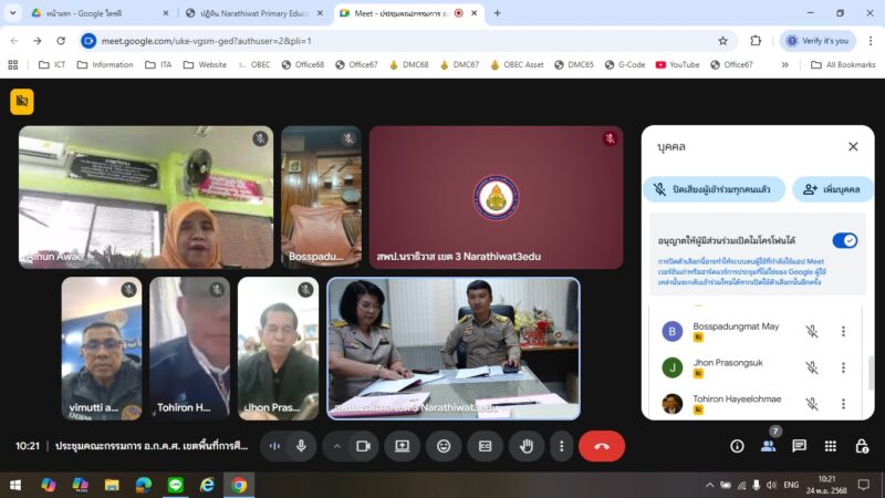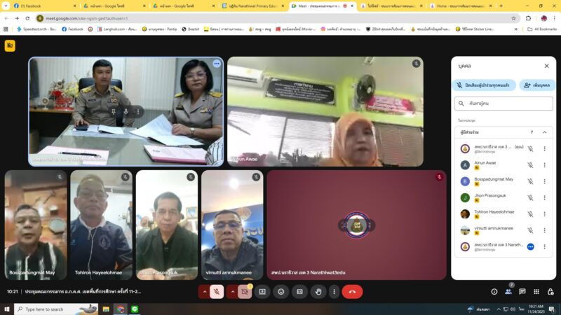 >>>>>>วันที่ 24 พฤศจิกายน พ.ศ.2568 เวลา 10:00น. นายตอฮีรน หะยีเลาะแม ผู้อำนวยการสำนักงานเขตพื้นที่การศึกษาประถมศึกษานราธิวาส เขต 3 ร่วมประชุม อ.ก.ค.ศ. เขตพื้นที่การศึกษาประถมศึกษานราธิวาส เขต 3 ครั้งที่ 12/2568 ผ่านระบบ Google Meeting ณ ห้อง รอง ผอ.สพป.นราธิวาส เขต 3 โดยมี นายมาหะมะพีสกรี วาแม ประธาน อ.ก.ค.ศ. เขตพื้นที่การศึกษาประถมศึกษานราธิวาส เขต 3 เป็นประธานการประชุม มีผู้เข้าร่วมการประชุมทั้งสิ้น 13 ท่าน ในการประชุมครั้งที่ 12/2568 คณะ อ.ก.ค.ศ. เขตพื้นที่การศึกษาประถมศึกษานราธิวาส เขต 3 ได้พิจารณาการประเมินเตรียมความพร้อมและพัฒนาอย่างเข้มให้ดำรงตำแหน่งครูผู้ช่วย การย้ายข้าราชการครูและบุคลากรทางการศึกษา การประเมินวิทยฐานะ และวาระอื่นๆ เพื่อพิจารณา