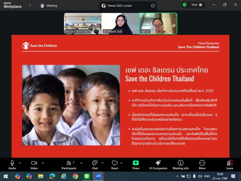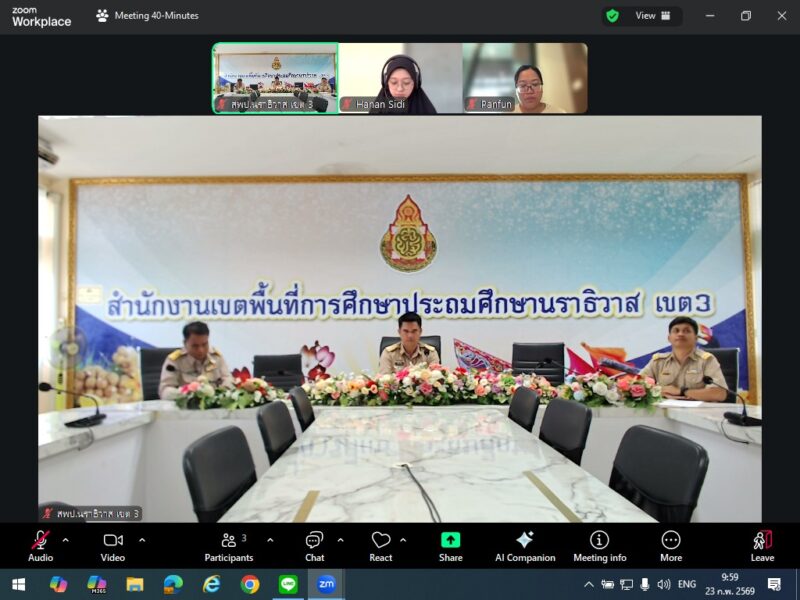 วันที่ 23 กุมภาพันธ์ พ.ศ.2569 เวลา 10:00น. นายตอฮีรน หะยีเลาะแม ผู้อำนวยการสำนักงานเขตพื้นที่การศึกษาประถมศึกษานราธิวาส เขต 3 มอบหมายให้นายวุฒิชัย ไชยสุข ผู้อำนวยการกลุ่ม และเจ้าหน้าที่ ร่วมประชุมเพื่อแนะนำองค์กรและโครงการ การให้ความช่วยเหลือเด็กและครอบครัวจากสถานการณ์อุทกภัย จาก เซฟ เดอะ ชิลเดรน ประเทศไทย (มูลนิธิช่วยเหลือเด็ก ประเทศไทย) เป็นองค์กรด้านมนุษยธรรมระหว่างประเทศที่ งานในประเทศไทยมาอย่างต่อเนื่อง โดยมุ่งเน้นการคุ้มครองและส่งเสริมสิทธิเด็ก การลดความเสี่ยงจากภัยพิบัติ ช่วยเหลือด้านมนุษยธรรมในสถานการณ์ฉุกเฉิน ร่วมกับหน่วยงานภาครัฐและภาคีเครือข่ายในระดับพิ้นที่ จากสถานการณ์อุทกภัยที่เกิดขึ้นในพื้นที่ภาคใต้ ระหว่างเดือนพฤศจิกายน ถึงธันวาคม พ.ศ. 2568 ซึ่งส่งผลกระทบต่อเด็ก ครอบครัวสถานศึกษาในหลายพื้นที่ มูลนิธิฯ ได้ดำเนินโครงการให้ความช่วยเหลือเด็กและครอบครัวที่ได้รับผลกระทบจากอุทกภัย เพื่อสนับสนุนการฟื้นฟูด้านการศึกษาและความเป็นอยู่ของเด็ก และช่วยให้เด็กสามารถกลับเข้าสู่ระบบการเรียนได้ ผ่านระบบ Zoom meeting ณ ห้องประชุมจะแนะ สพป.นราธิวาส เขต 3
