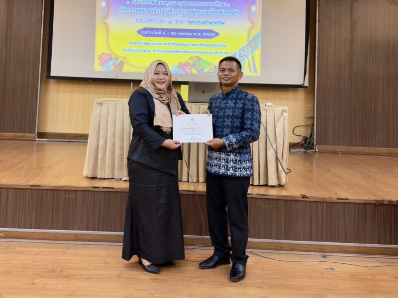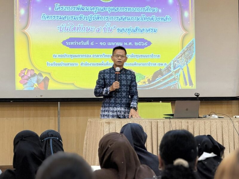 วันที่ 9 เมษายน พ.ศ.2569 เวลา 9:00น. นายตอฮีรน หะยีเลาะแม ผู้อำนวยการสำนักงานเขตพื้นที่การศึกษาประถมศึกษานราธิวาส เขต 3 เป็นประธานเปิดโครงการพัฒนาครูและบุคลากรทางการศึกษา กิจกรรมอบรมเชิงปฏิบัติการการสอนภาษาไทยด้วยพลัง “บันไดทักษะ 4 ขั้น” ของทุ่งสักอาศรม ศูนย์เครือข่ายสถานศึกษาบองอ ระหว่างวันที่ 5 – 10 เมษายน พ.ศ.2569 ณ หอประชุมผกากรอง อาคารวิทยาลัยชุมชนจังหวัดนราธิวาส