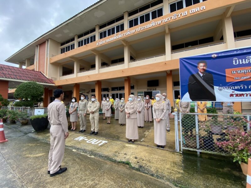 >>>>>วันที่ 28 กุมภาพันธ์ พ.ศ.2565 เวลา 8:00น. นายศุภชัย ศรีหาใต้ ผอ.สพป.นราธิวาส เขต 3 พร้อมด้วยรอง ผอ.สพป.นราธิวาส เขต 3 และบุคลากร สพป.นราธิวาส เขต 3 ร่วมเข้าแถวเคารพธงชาติ เพื่อแสดงความจงรัก ภักดีต่อชาติ ศาสนา และพระมหากษัตริย์ ทั้งนี้นายศุภชัย ศรีหาใต้ ผอ.สพป.นราธิวาส เขต 3 ได้พบปะบุคลากร สพป.นราธิวาส เขต 3 เพื่อแจ้งข่าวสารและข้อราชการให้บุคลากร รับทราบ
